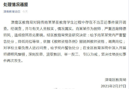 25日当晚,天津津南区教育局发布通报,对涉事教师肖某某停职。27日,区教育局再发处理情况通报称,情况属实。决定给予肖某某党内严重警告处分,降低岗位等级,撤销其教师资格,调离岗位;对学校主要负责人进行问责,给予党内警告处分。