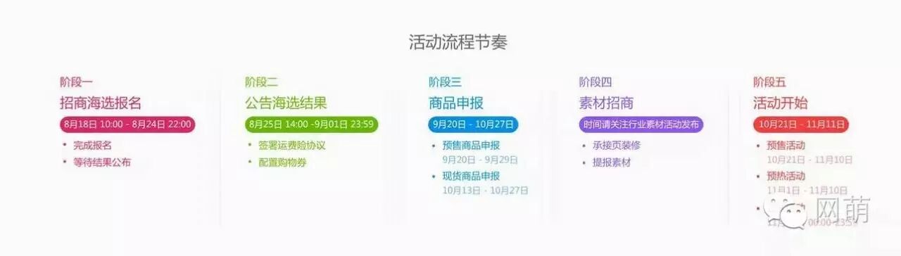 本月18日上午10点,天猫官方正式公布2016年天猫双十一全球狂欢节招商规则以及活动流程。第八个双11正式进入报名角逐阶段。现整理相关信息如下: