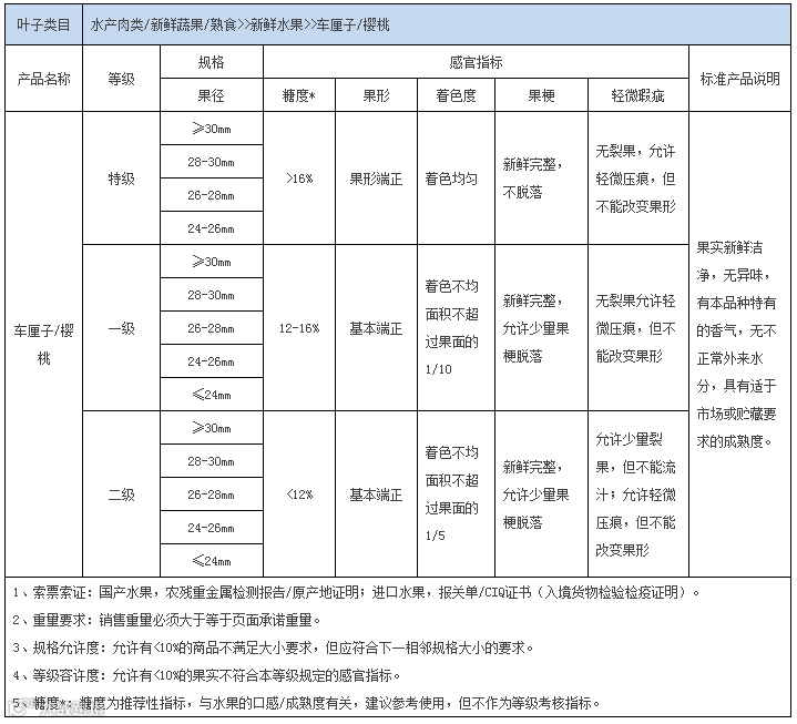 内容:天猫新增《车厘子/樱桃分等分级标准》、《苹果分等分级标准》、《火龙果分等分级标准》。详细标准如下: