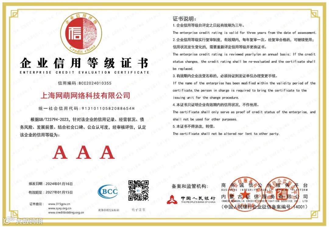 “AAA企业信用等级证书”是企业信用评定的最高级别。据悉,本次审核评估主要针对网萌的信用记录、经营状况、债务风险、发展前景、综合社会口碑、公众认可度进行考察评估,最终评价结果在9个方面荣获最高等级的“AAA级企业信用等级”证书及信用等级牌匾。
