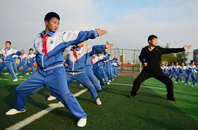 2020年11月19日,河北沧州青县实验小学的学生在体育老师的指导下练习盘古王拳。