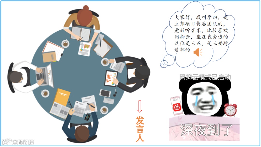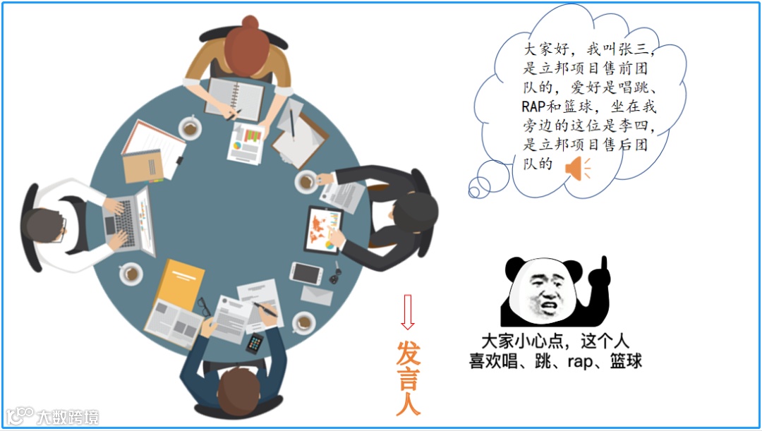 用3分钟相互认识,然后顺时针进行自我介绍,介绍自己的姓名+部门+兴趣爱好,并说出邻座小伙伴的姓名+部门..