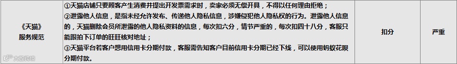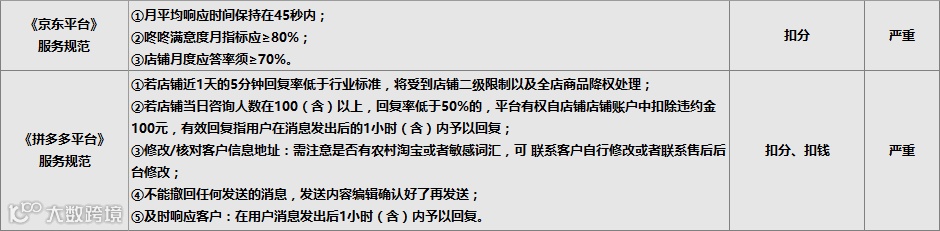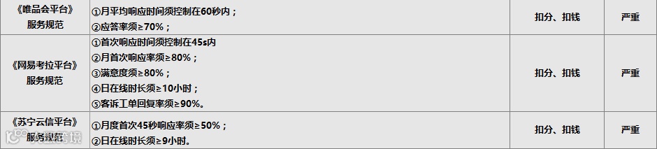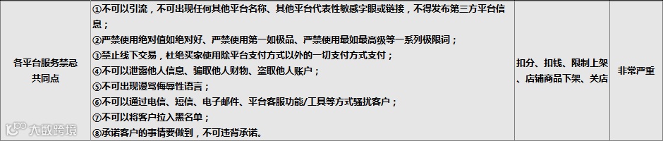 其中包含客服小伙伴常用的天猫,京东平台,还增添小红书,网易考拉,拼多多等小众平台。要求严苛的平台禁忌知识,其中包含平台、条款明细、处罚措施、严重程度。除以往大家知道的扣分降级之外,还有直接扣钱处罚。所以小伙伴在接触新平台的时候要特别小心