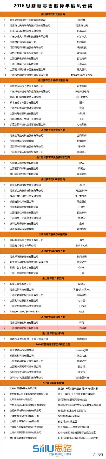 在12月21日的颁奖典礼上,颁出了包括“杰出新零售服务案例”“2016思路新零售服务商明日之星”“杰出新零售运营服务商”“杰出新零售仓储/物流服务商”“杰出新零售系统服务商”“杰出新零售客户关系管理服务商”“杰出新零售ERP服务商”等12个奖项。