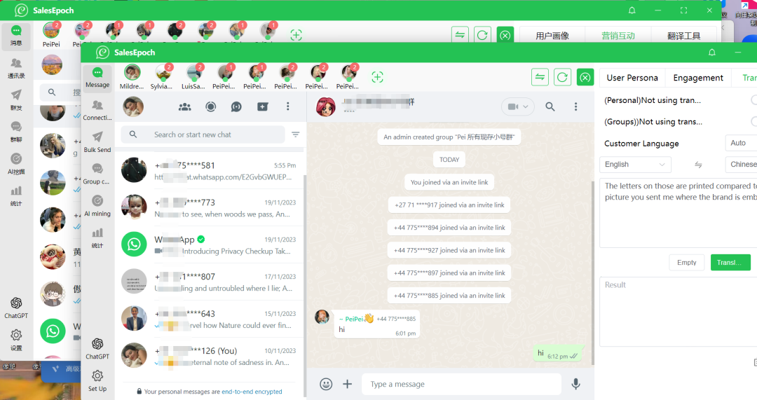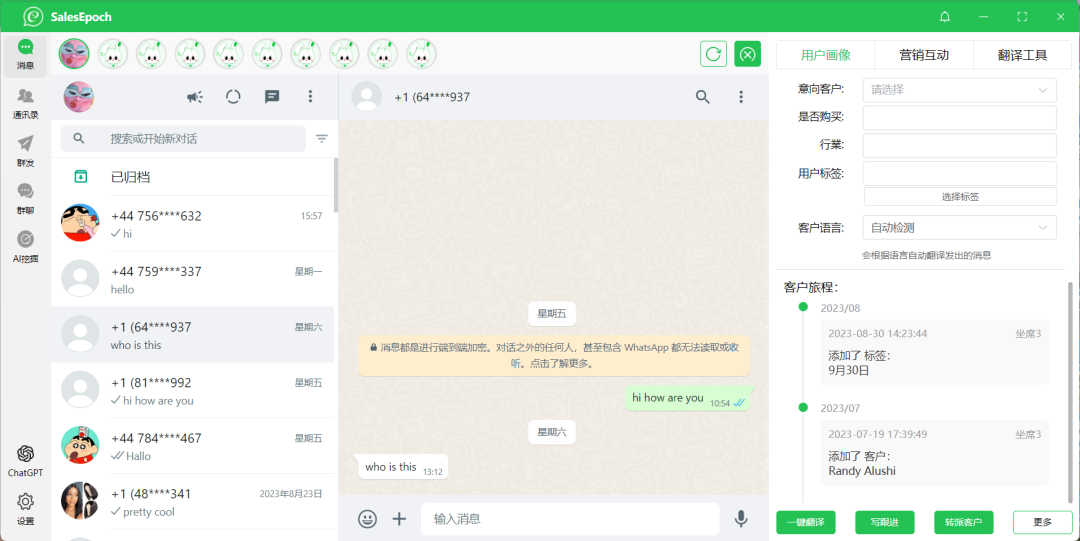 行走江湖,语言不通犹如蒙眼作战。但销售宝这位高手身怀 “通天译心诀”,接入全球主流翻译引擎,堪称 “语言界的扫地僧”。无论是一对一私密交谈,还是百人跨国大群聊,它都能自动双向翻译,让中文、英文、阿拉伯语等语言瞬间互通。客户说什么,它立刻 “读心” 翻译,你想回复什么,它秒变 “同声传译”,真正打破语言壁垒,实现全球客户无障碍畅聊。