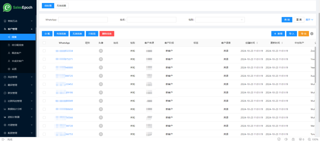 其次,在WhatsApp SCRM销售宝的后台结合客户信息表,直接一键导入和群发,对大量客户进行批量触达,筛选出有意向的客户进一步沟通。