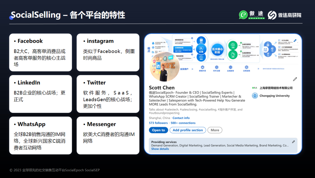 傲途的社交销售成员会结合自己的专长和资源选择合适的行业场景进行内容输出。比如说针对海外实体零售店、海外SaaS、外贸、跨境平台商家、移动互联网出海等不同场景创建不同的社媒平台专家形象,进行持续性内容输出。