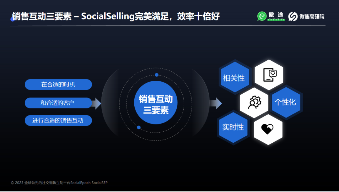 销售互动讲究在合适的时机与合适的客户进行合适的互动,其实就是在遵循销售互动的三要素:相关性、实时性、个性化。