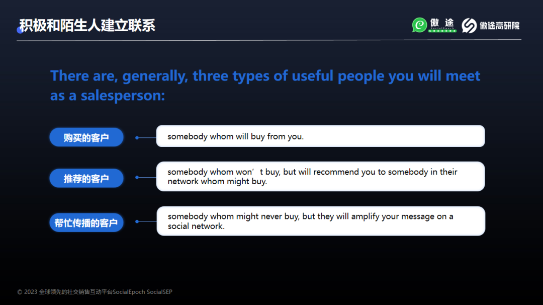 对于社交销售运营者们来说,社交互动就是互动一切可以互动的陌生人,与他们沟通交流,挖掘背后的商业价值。这些群体主要有三类: