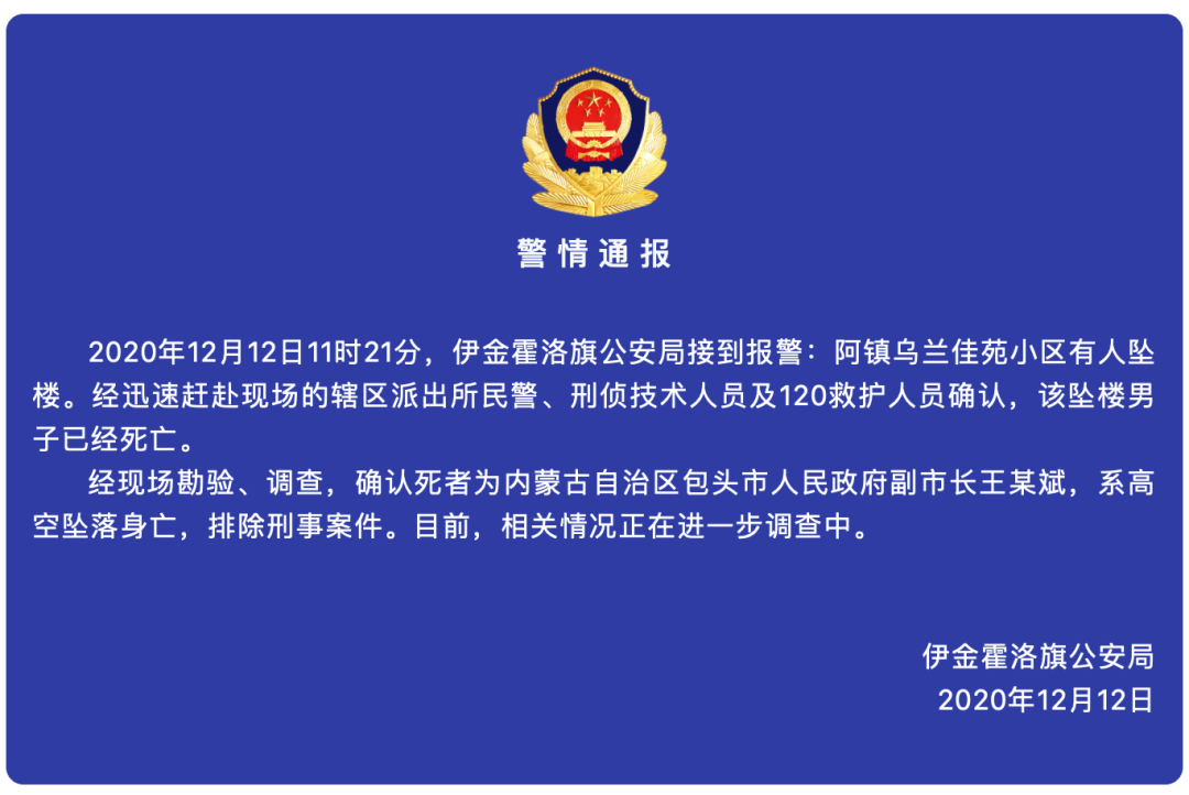 经现场勘验、调查,确认死者为内蒙古自治区包头市人民政府副市长王某斌,系高空坠落身亡,排除刑事案件。目前,相关情况正在进一步调查中。