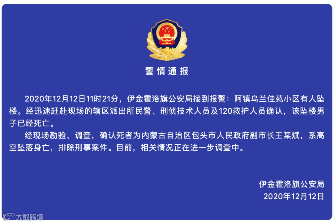 12日晚,内蒙古包头市副市长王美斌从鄂尔多斯市伊金霍洛旗家中坠楼身亡的消息引起广泛关注。13日凌晨2时30分许,伊金霍洛旗公安局通报了案情细节。