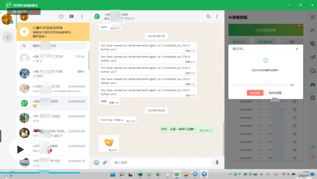 采集过程中可以选择停止挖掘(直接结束挖掘)和后台云挖掘(不影响运营宝其他操作),边挖掘边聊单不影响工作。