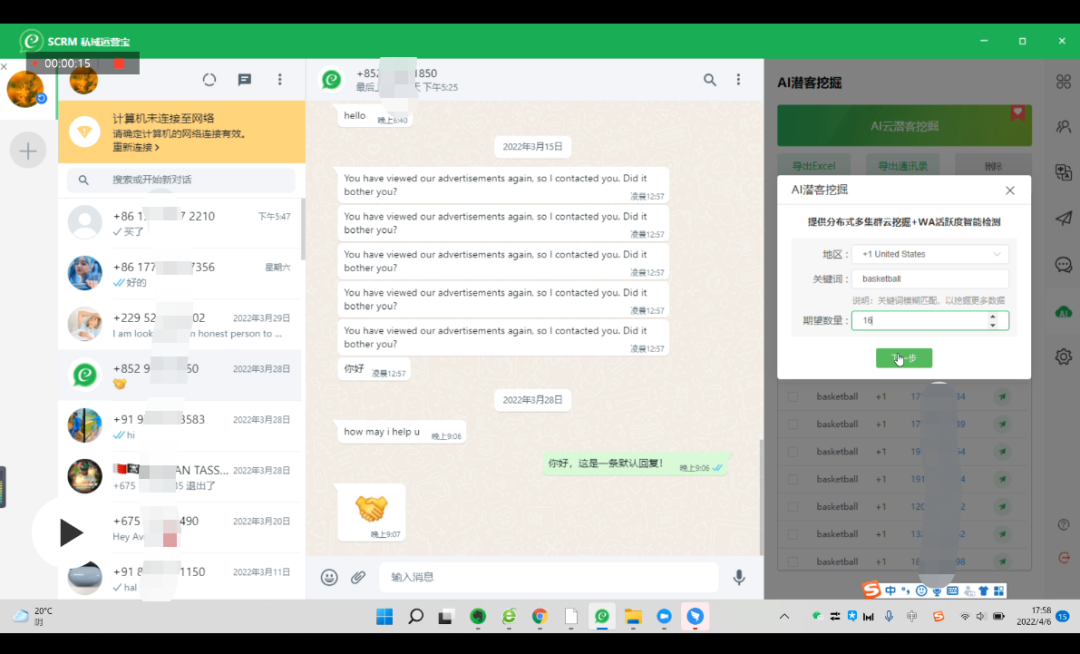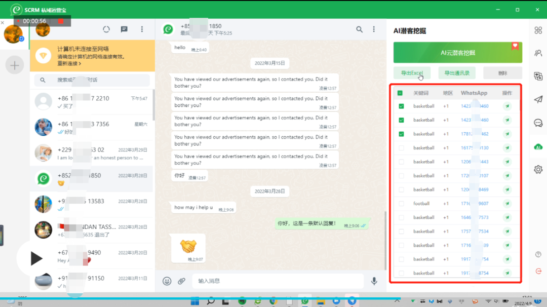 上图右侧就是挖掘的客户联系方式,可以直接利用WhatsApp进行联系。