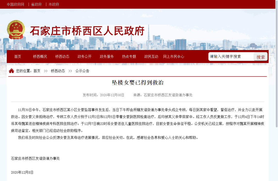 据河北省石家庄市桥西区友谊街道办事处消息:11月30日中午,石家庄市桥西区某小区女婴坠落事件发生后,当日下午即由所辖友谊街道办事处牵头成立专班,每日到其家中看望,督促治疗,并全力以赴开展救治。
