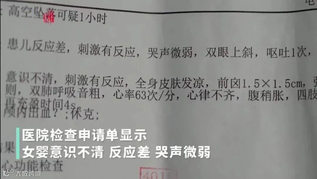 事发后,女婴很快被送往医院进行救治。医院检查申请单显示, 女婴意识不清、反应差、哭声微弱。