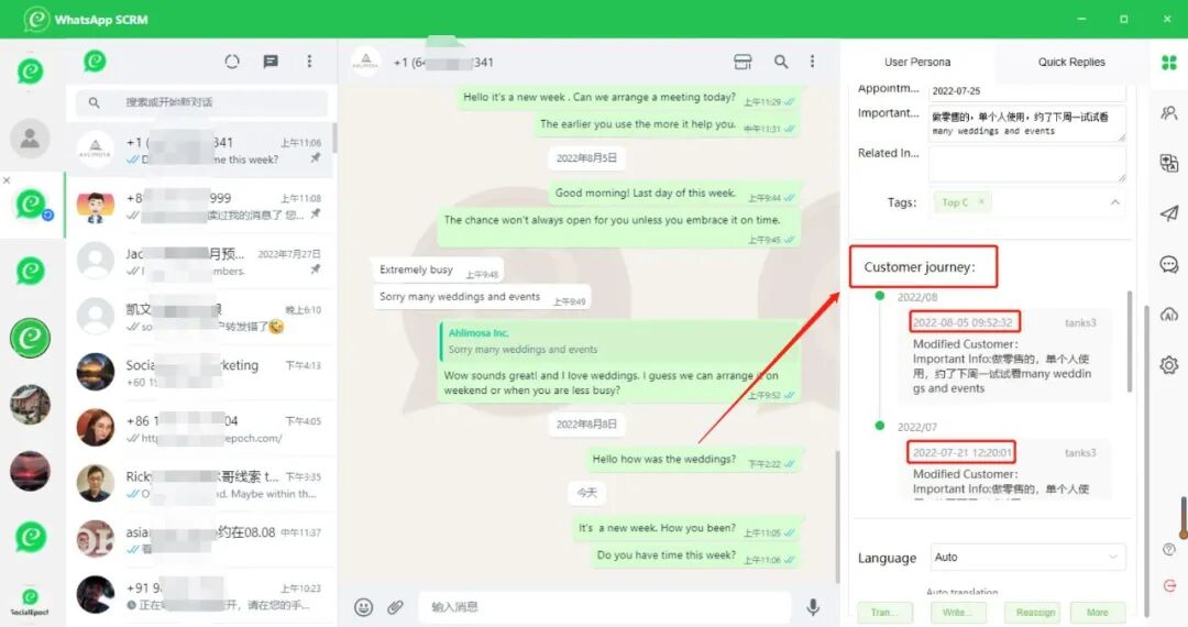 WhatsApp SCRM,通过客户会话框右侧的信息栏功能,帮助工作人员及时高效地记录客户信息,直观地查阅洞悉客户情况,消除信息滞后、孤岛、不同步等问题,提高内部信息沟通流转效率,用在线化数字化的信息协同消除无端内耗。