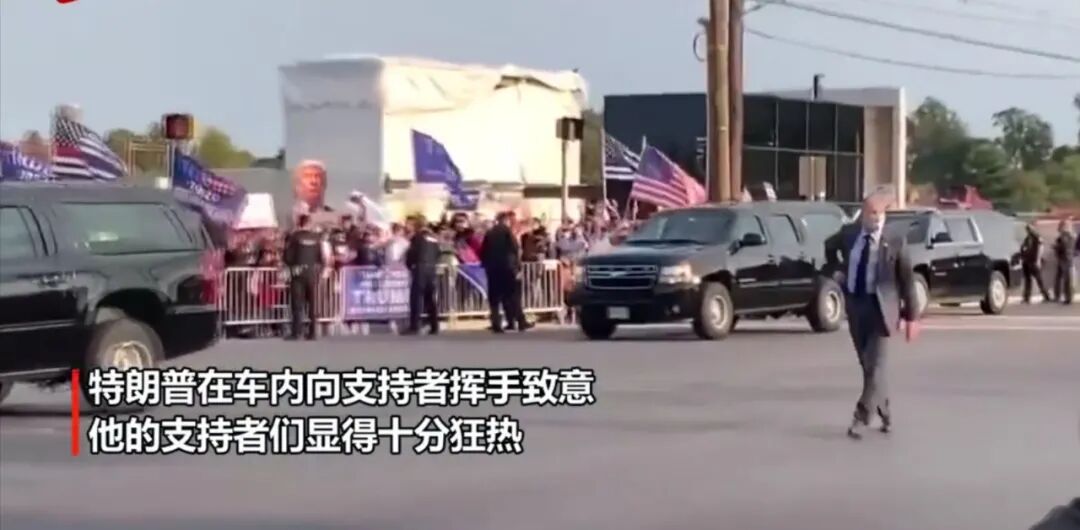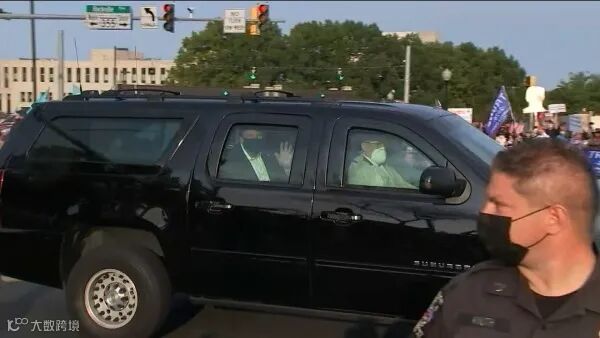 特朗普乘专车向医院外的支持者挥手致意。来源:环视频