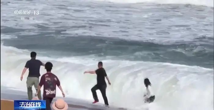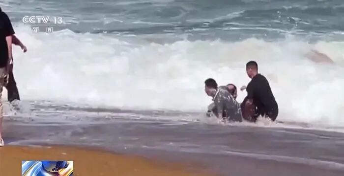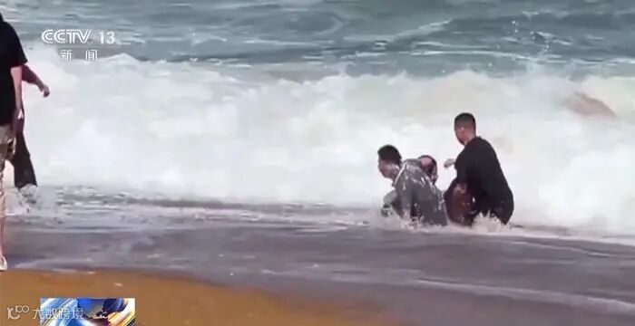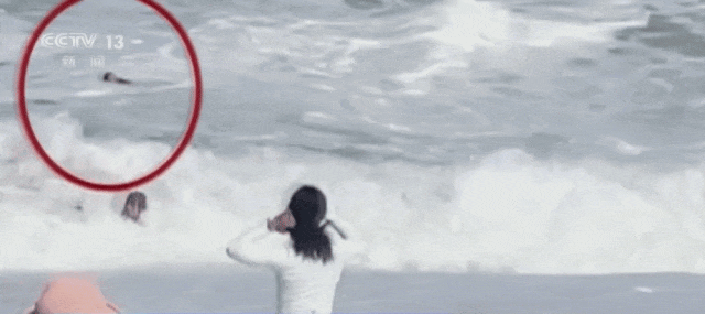 画面中可以看到,小女孩被海水卷走,距离岸边越来越远,而孩子的母亲却在海水的冲击下,无法靠近自己的孩子。危急关头,一名身穿白色上衣的长发男子从人群中闪出,冲向海边,先将孩子的母亲救到岸边安全的位置。