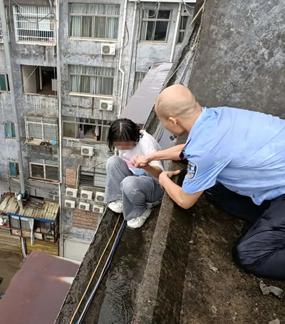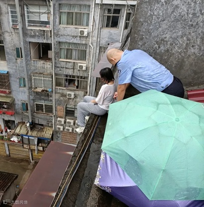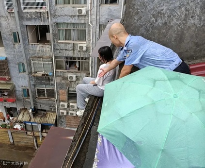 飞奔至6楼楼顶,他看见一个女孩坐在狭窄的屋顶边沿,情绪激动,不时大声哭喊。