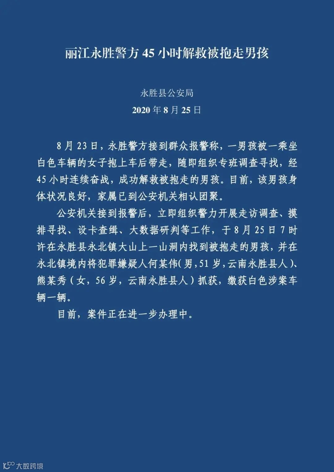 8月25日,据丽江永胜警方消息,经过45小时连续奋战,成功解救被抱走的男孩,目前该男孩身体状况良好,家属已到公安机关相认团聚。