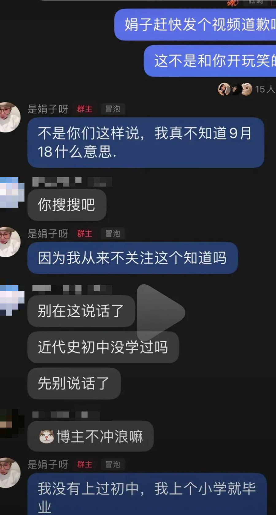 在网友的持续质问中,“娟子”在线回怼网友称自己“没有上过学”“没有念过书”“不看新闻”“没听说过‘九一八’”,说完还掩嘴大笑。