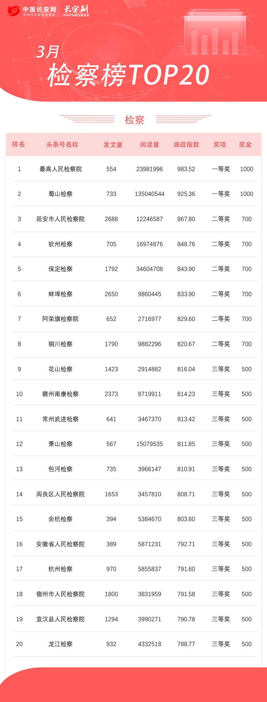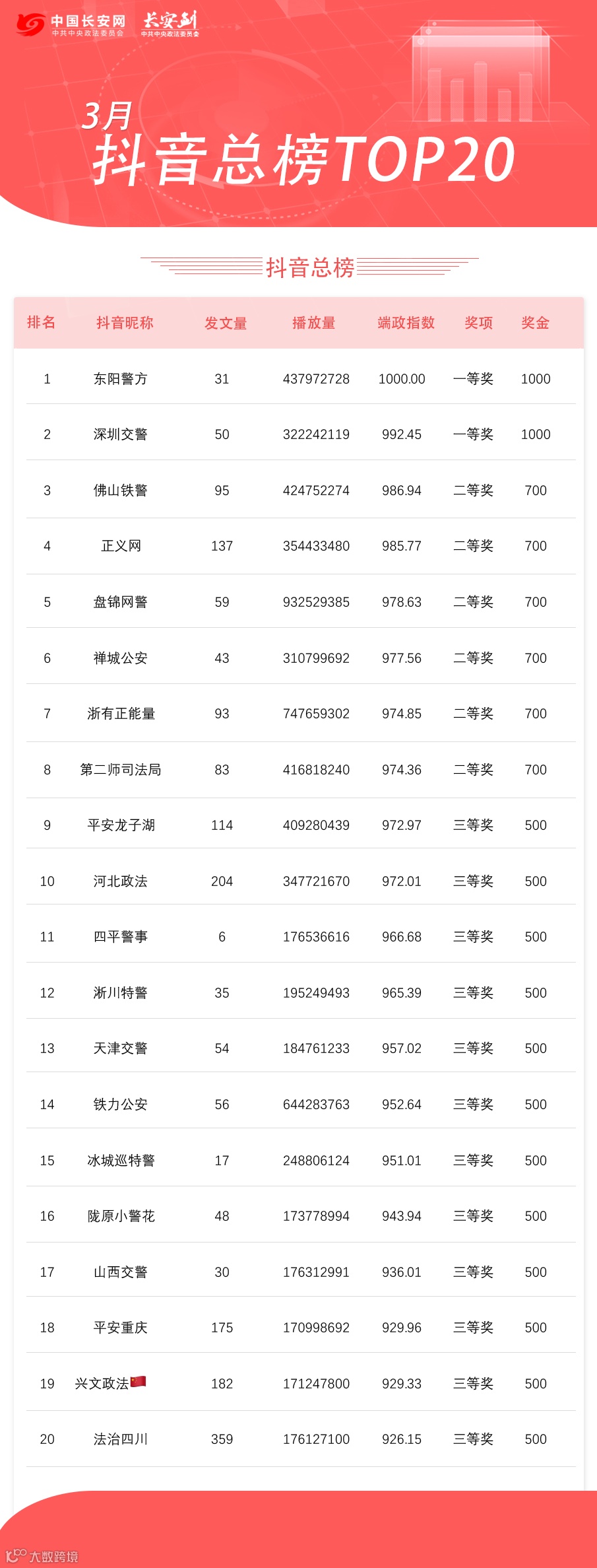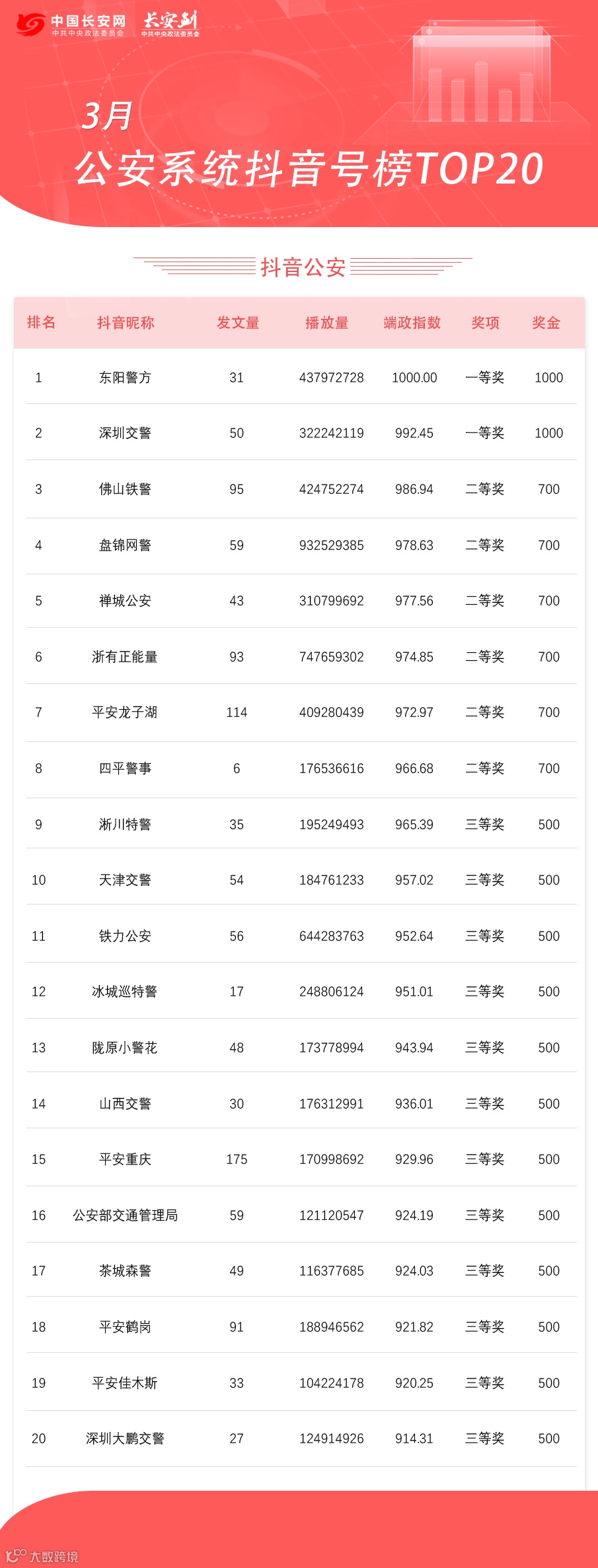 抖音公安榜TOP20