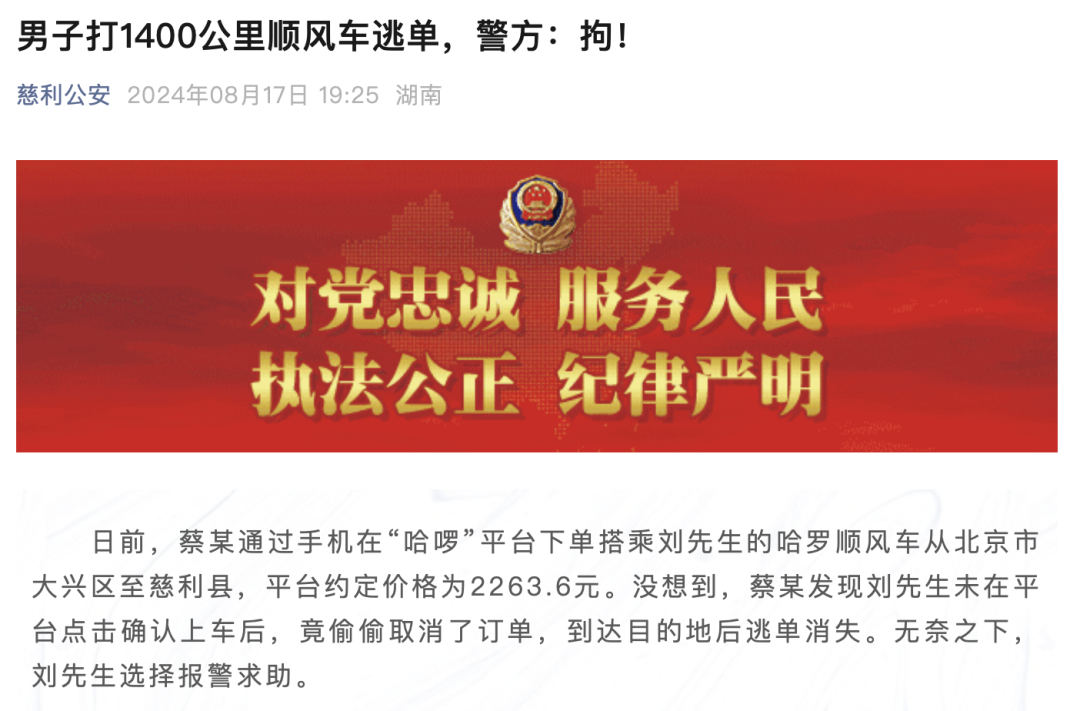 8月17日,湖南省张家界市慈利县公安局发布消息,违法行为人蔡某如实交代了其在平台下单搭乘刘先生的顺风车从北京市大兴区至湖南省张家界市慈利县后故意逃单的违法行为,目前蔡某已被慈利县公安局行政拘留。
