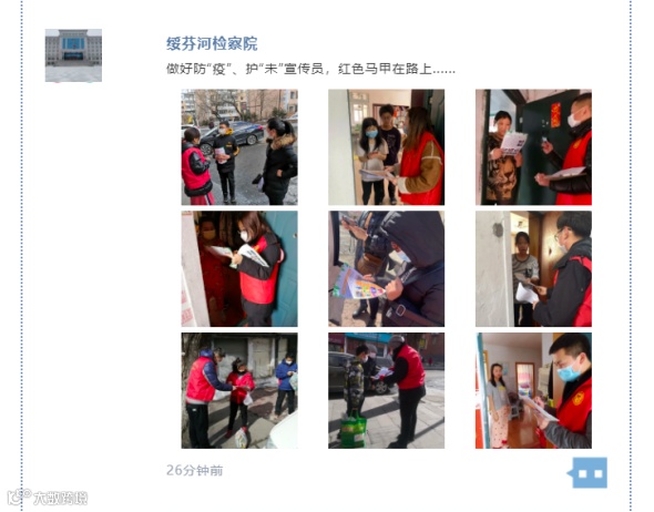 绥芬河市检察院下沉社区,网格化开展未成年人司法保护法治宣传 同社区合作成立“春苗志愿服务队”,借助社区网格化管理平台、微信工作群和上门宣传,引导广大社区居民和未成年人观看法治教育“云”课堂。(龙江检察微信公众号)