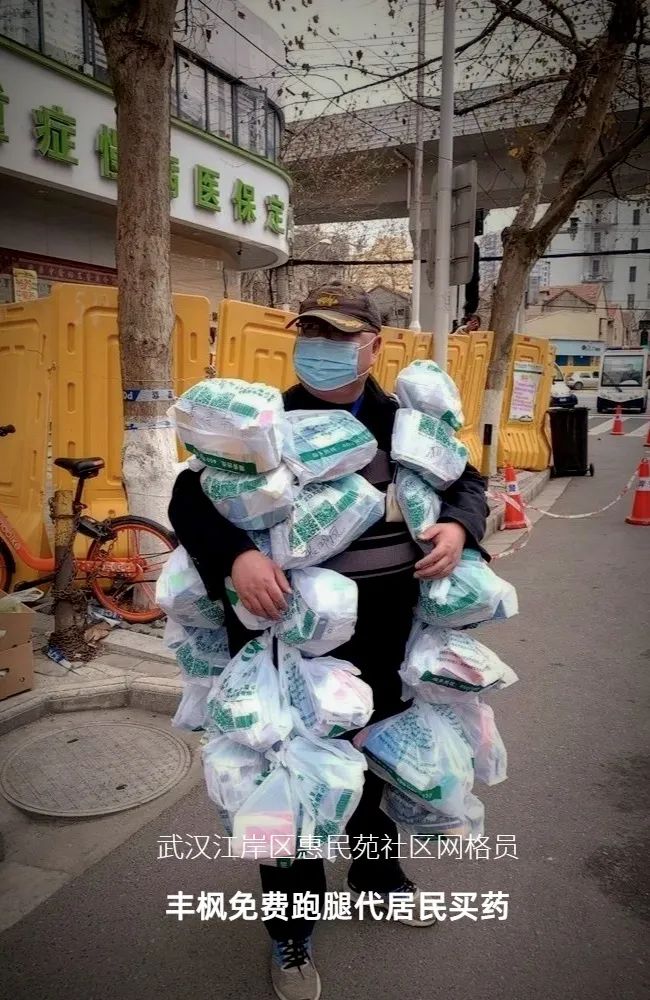 惠民苑社区网格员丰枫身上挂满为居民买的药