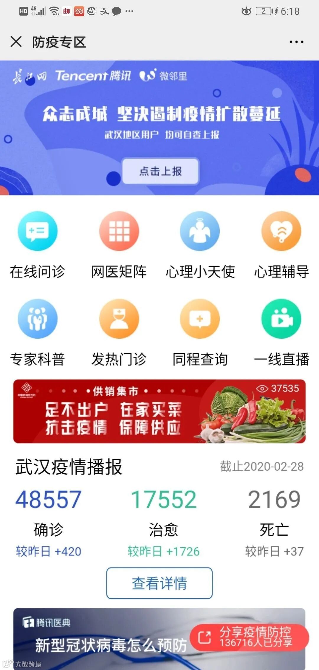 自1月23日以来,先后上线了“肺炎自查上报”“邻里关爱行动”“心理辅导”“网医矩阵”“家庭体温上报”等十余项功能。