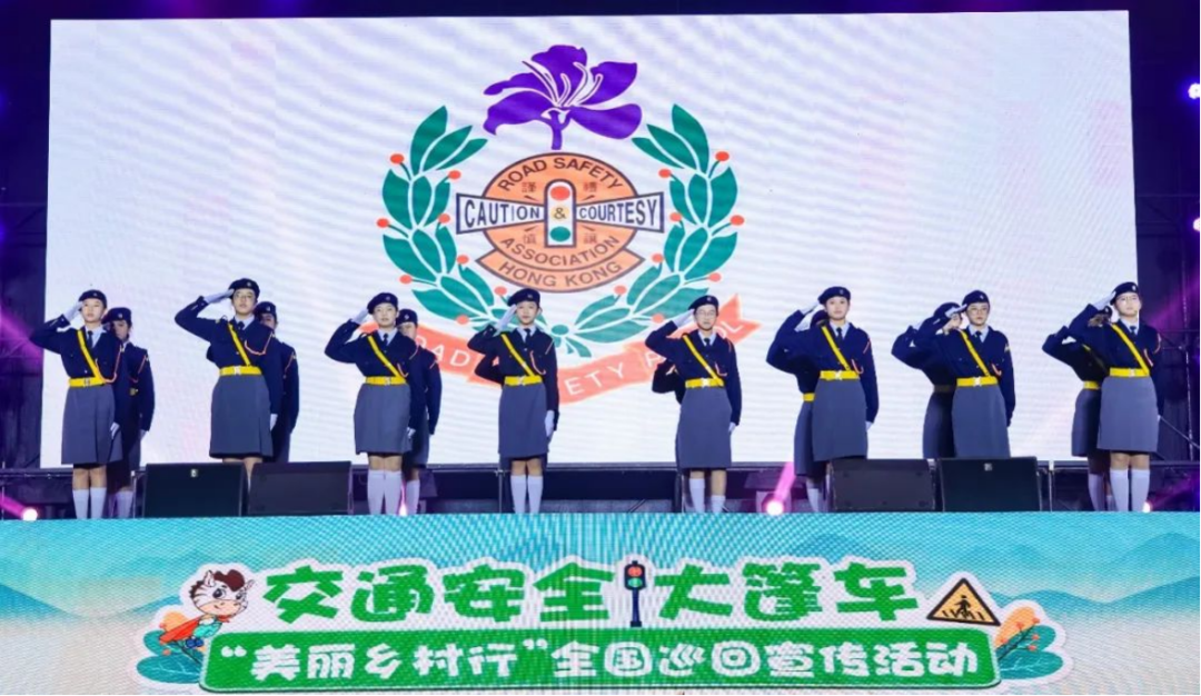 香港学生交通安全队随后登场,他们迈着整齐划一、铿锵有力的步伐进行花式队列表演,描绘湾区平安出行的新愿景。