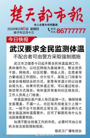 4、湖北武汉要求全民监测体温 武汉6日起开展全民体温监测工作,将以社区网格为基础单元,采取上门排查与自查自报相结合的方式展开,如遇不配合排查工作的市民,必要时可由公安机关依法采取强制措施。(@楚天都市报)