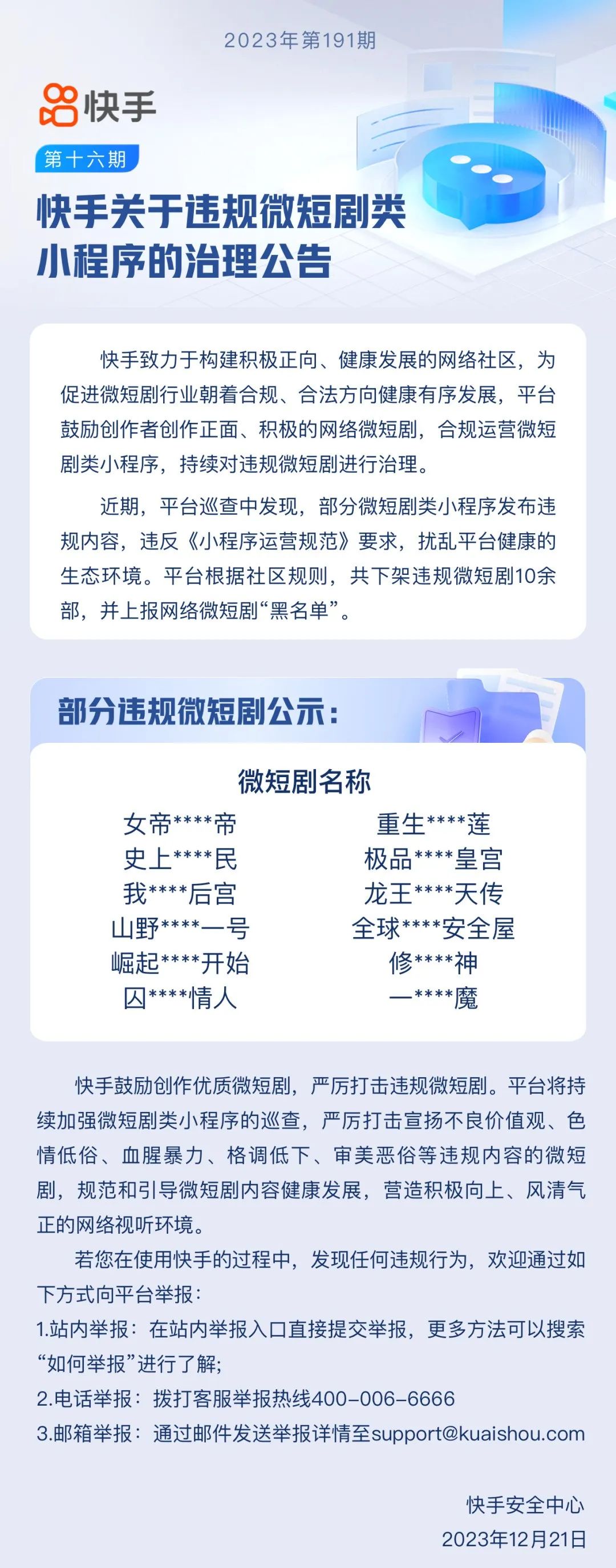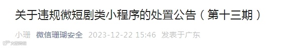 近期,微信平台通过巡查审核发现,部分微短剧类小程序存在未进行剧目合规备案或存在不良导向价值观内容等行为。根据国家相关法律法规要求以及《腾讯微信软件许可服务协议》《微信小程序运营规范》的相关规定,微信平台下架了部分违规微短剧剧目,并对相关违规小程序进行处置。