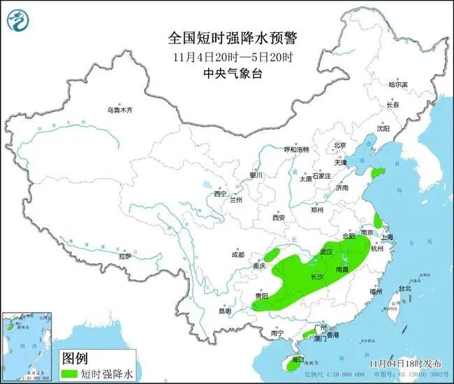 预计11月4日20时至5日20时,安徽南部、湖南中南部、江西中北部、贵州南部、广西北部等地的部分地区将有8-10级雷暴大风或冰雹天气;安徽中南部、湖北东部、湖南大部、江西中北部、重庆东南部、贵州东部和南部、广西北部、广东西南部、海南岛等地的部分地区将有短时强降水天气,最大小时雨量20-30毫米,局地可达50毫米以上。
