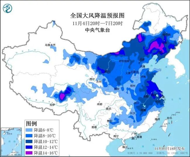 受强冷空气影响,预计,11月4日20时至11月7日20时,西北地区中东部及我国中东部大部地区气温将下降6~10℃,其中,内蒙古中部和东部、东北地区中南部、江淮中东部等地部分地区气温将下降12~14℃,吉林西南部、辽宁西北部、内蒙古东南部等地局地降温可达16℃以上;最低气温出现在7日早晨,最低气温0℃线将位于河北北部、北京南部、山西南部至陕西关中平原、甘肃东南部一带,长江中下游沿江大部地区最低气温将降至10℃左右。长江中下游以北地区有4~6级偏北风,阵风7~9级,局地可达10级;5日至6日,渤海、黄海、东海等海域有6~8级风,最大阵风9~10级。