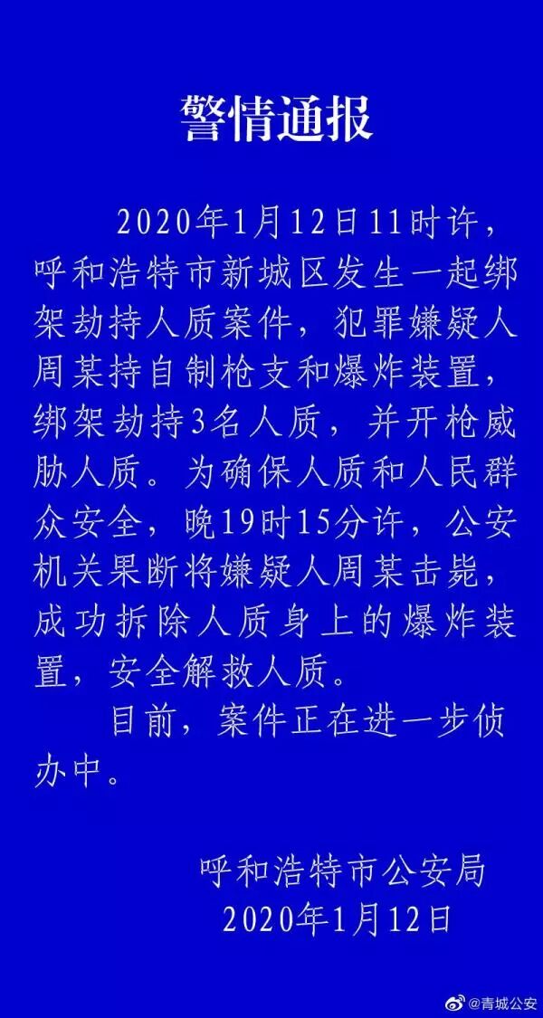 据内蒙古呼和浩特市公安局官方微博1月12日消息,12日11时许,呼和浩特市新城区发生一起绑架劫持人质案件,犯罪嫌疑人周某持自制枪支和爆炸装置,绑架劫持3名人质,并开枪威胁人质。为确保人质和人民群众安全,当日19时15分许,公安机关果断将嫌疑人周某击毙,成功拆除人质身上的爆炸装置,安全解救人质。