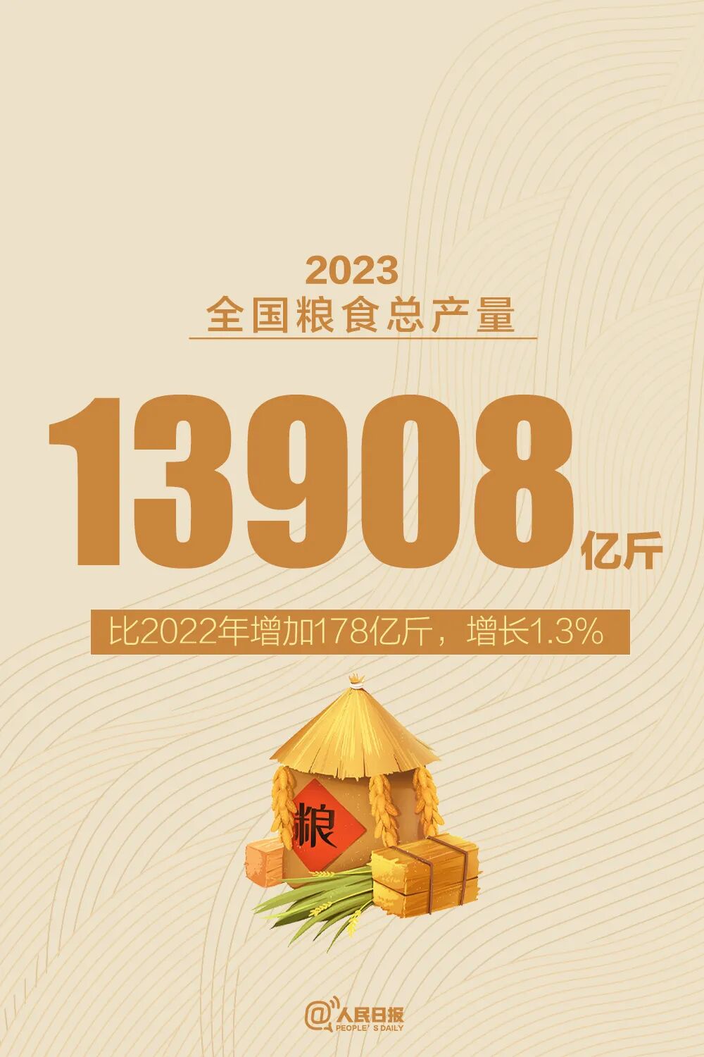 全国粮食总产量69541万吨(13908亿斤),比2022年增加888万吨(178亿斤),增长1.3%。