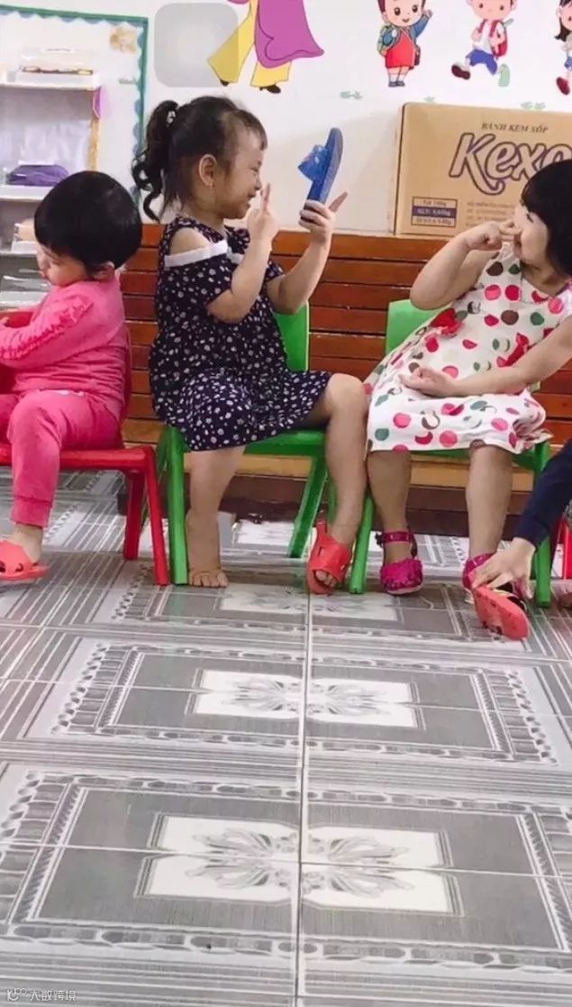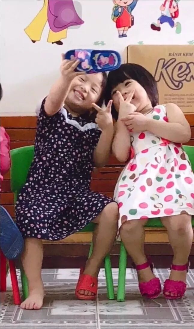 孩子的快乐真的好简单,这对小姐妹正用拖鞋当道具自拍,表情十分到位。