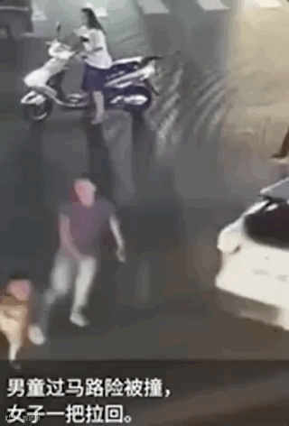 一位路过的女子见状,赶紧从电动车跳下来,跑向男童将他一把拉住,几乎同时,一辆小车与两人擦肩而过。