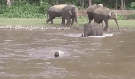 小象以为这个人溺水了,赶紧淌着急流过去救他,还用鼻子把他护在自己的身体下。