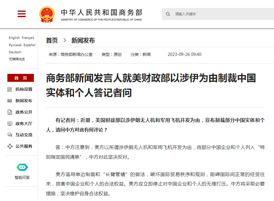 有记者问:近期,美国财政部以涉伊朗无人机和军用飞机开发为由,宣布制裁部分中国实体和个人,请问中方对此有何评论?