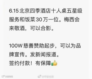花30万可让梅西敬酒?北京警方回应 近日,一张流传的网图上写着,“6.15北京四季酒店十人桌五星级服务和饭菜30万一位。梅西会来敬酒,可以合影。”5日,北京市公安局回应,“如果这三十万能被骗了,那警察叔叔敬你一杯。”