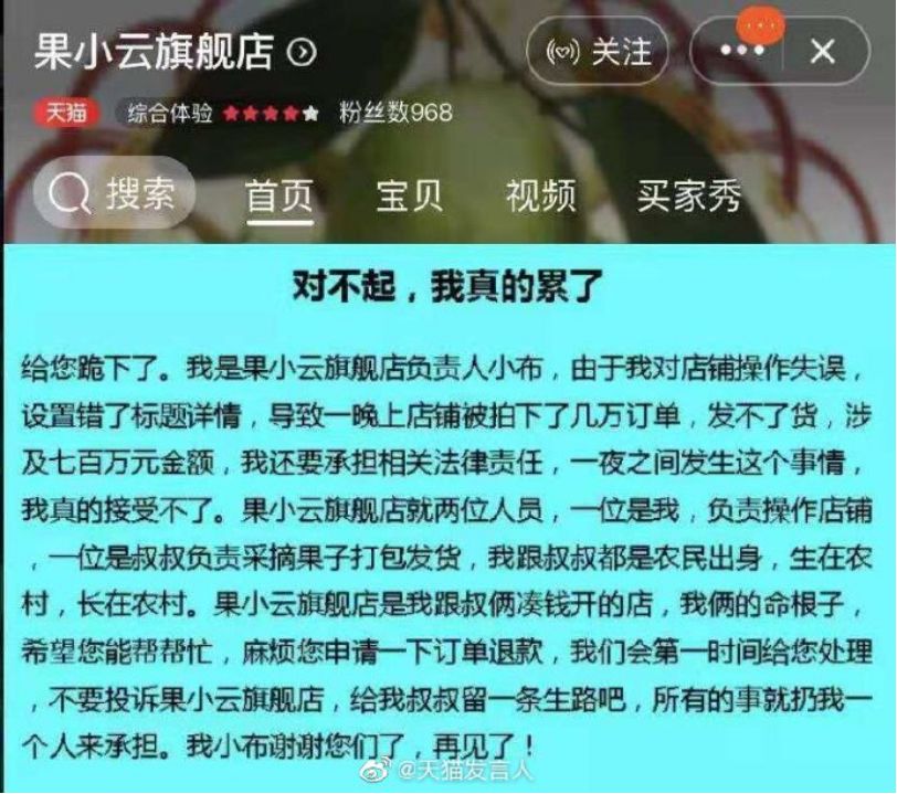 欲哭无泪的店主发布致歉信,告知店里是两个农民在经营,叔叔摘果子,她负责发货和淘宝客服,恳求“羊毛党们”不要投诉,申请退款订单,给他们一条生路。目前电商平台方已经把小店“保护”起来以避免更大损失,B站已经封禁该博主的站内账号,直至其妥善处理本次事件。