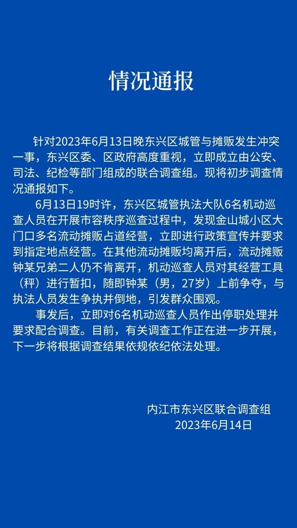 针对2023年6月13日晚东兴区城管与摊贩发生冲突一事,东兴区委、区政府高度重视,立即成立由公安、司法、纪检等部门组成的联合调查组。现将初步调查情况通报如下。
