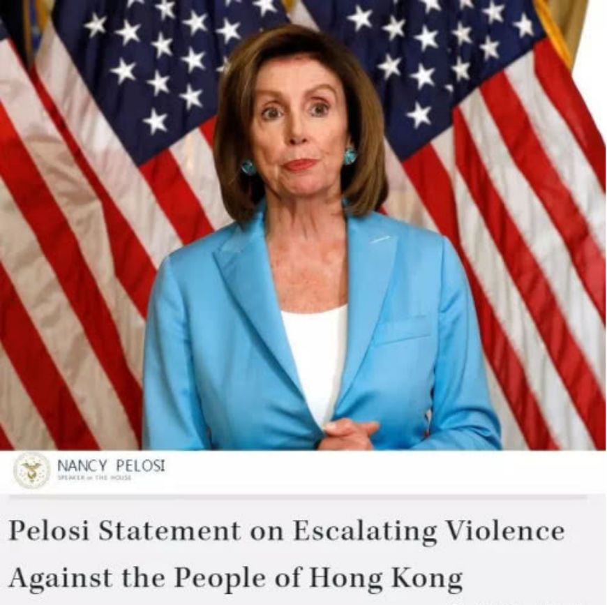 图:美国众议院议长佩洛西曾发表声明,称赞香港暴徒的“非凡勇气”,宣称将推动国会“维护香港的民主、自由和法治”。
