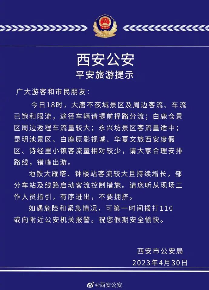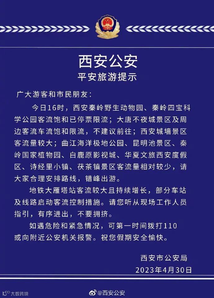 4月30日下午,大唐不夜城官方微博发布提示称,截至30日16时,大唐不夜城周边客流、车流已趋于饱和状态,为保障游客安全出行和游玩体验,建议错峰出行。游览观光时,请配合公安民警和现场工作人员的指挥疏导。