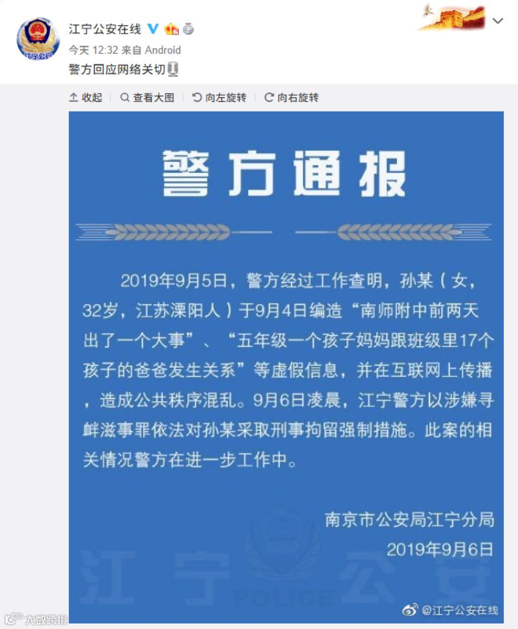 2019年9月5日,警方经过工作查明,孙某(女,32岁,江苏溧阳人)于9月4日编造“南师附中前两天出了一个大事”、“五年级一个孩子妈妈跟班级里17个孩子的爸爸发生关系”等虚假信息,并在互联网上传播,造成公共秩序混乱。9月6日凌晨,江宁警方以涉嫌寻衅滋事罪依法对孙某采取刑事拘留强制措施。此案的相关情况警方在进一步工作中。