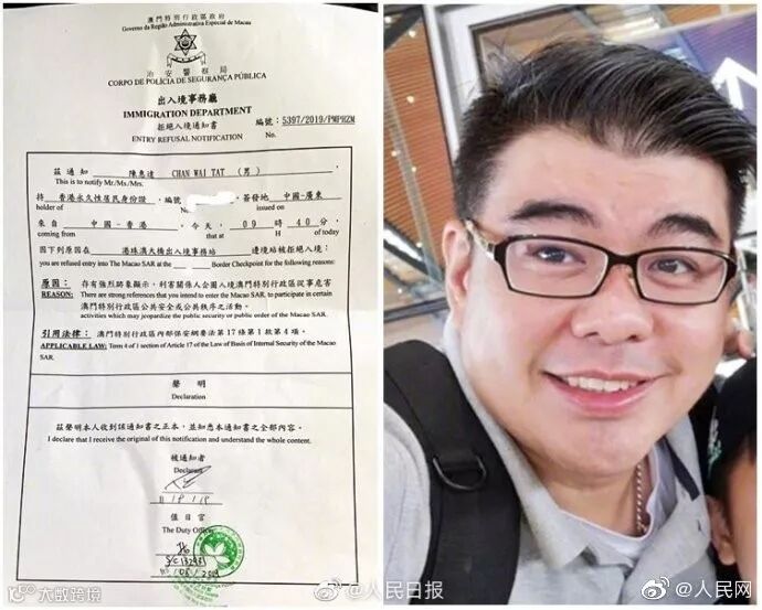 3、澳门拒绝辱警香港议员入境 陈惠达是香港泛民派政党“新民主同盟”成员,现为香港北区议会议员。自今年香港发生骚乱以来,他一直在煽风点火,并攻击侮辱香港警察。11日,陈惠达想要经港珠澳大桥前往澳门被拒绝入境,理由是此人企图“危害澳门公共安全或公众秩序”。(@人民网)