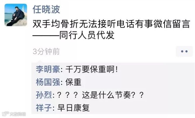 2、“双手均骨折无法接听电话有事微信留言” 22日,浙江温州鹿城公安民警任晓波在河南济源抓捕一名网络诈骗案嫌犯时受伤,经初步诊断右肘关节骨折伴脱位,左手掌骨疑似骨折。因无法接听电话,他委托医护人员发了一条朋友圈:双手均骨折无法接听电话有事微信留言——同行人员代发。这条朋友圈截图迅速在网上传播,许多网友为他加油打气,祝他早日康复。(@都市快报)
