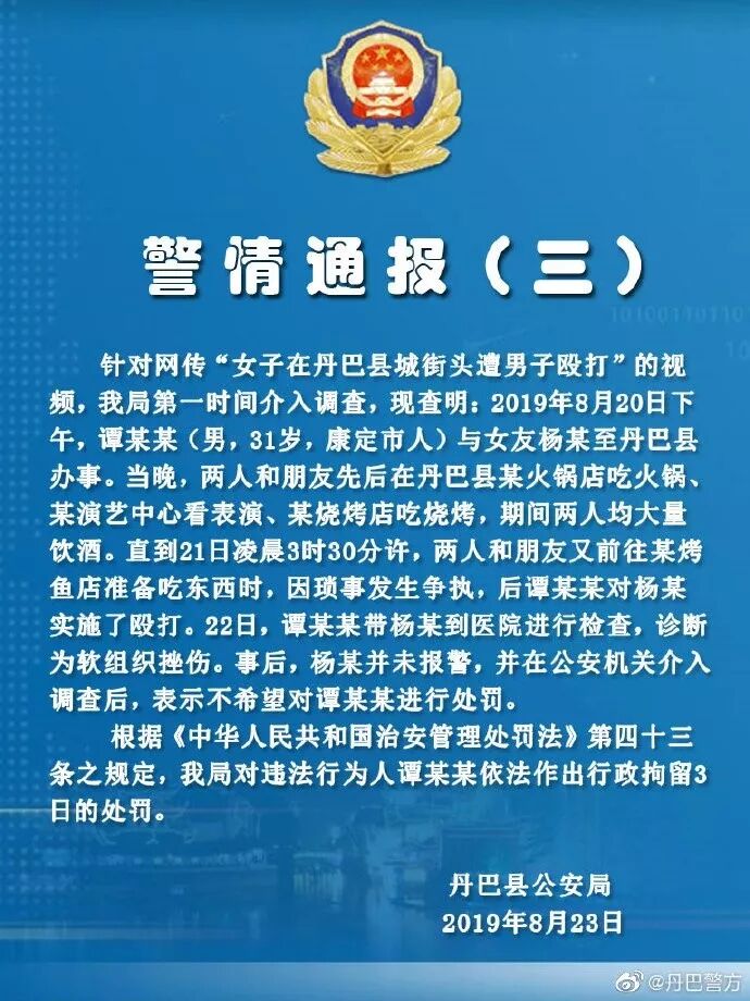 4、女子街头遭踢打:施暴者系男友不希望处罚 日前,网传一“女子在街头遭男子殴打”的视频。23日,四川丹巴警方公布调查情况:双方系情侣,当晚两人均大量饮酒。打人后男方带女方就医;警方介入后女方表示不希望处罚对方。打人者被依法行拘3日。(@澎湃新闻)